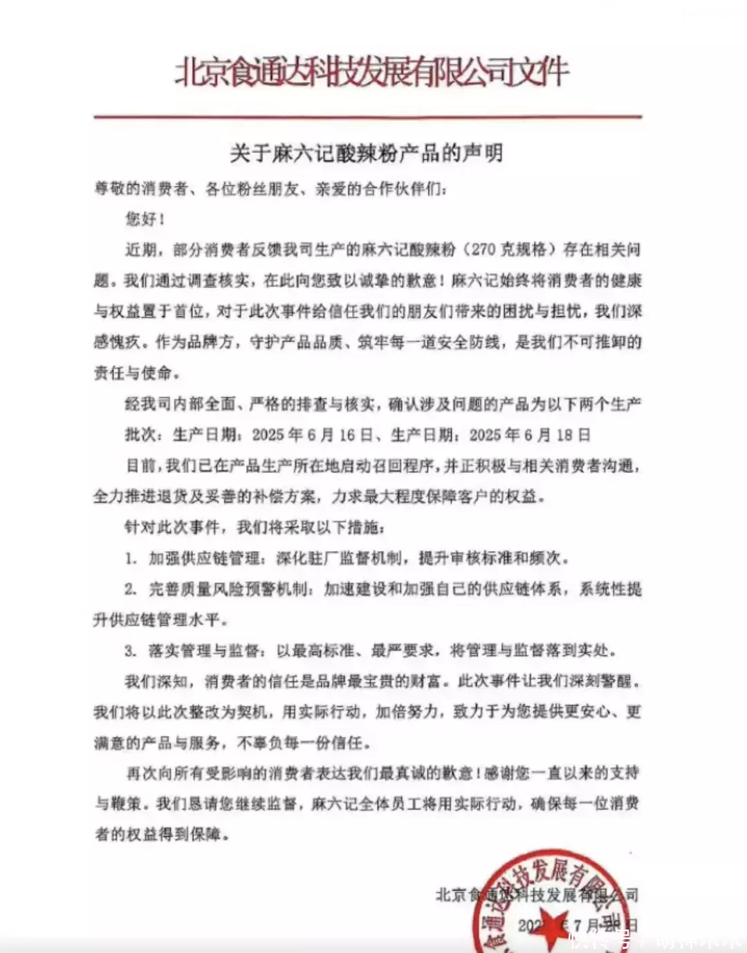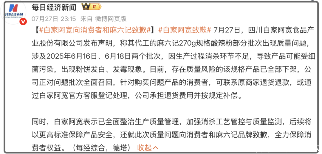 据悉,麻六记官方承认了两个生产批次的酸辣粉存在问题,并且召回了这两个批次的产品。紧接着,代工厂白家阿宽也发文,向消费者以及麻六记致歉,白家阿宽称是因为生产过程消杀环节不足,导致产品受到细菌污染,虽说这样的回应乍一看是解释了这次风波,但也正是因为白家阿宽的回应,让麻六记再次被消费者讨伐。