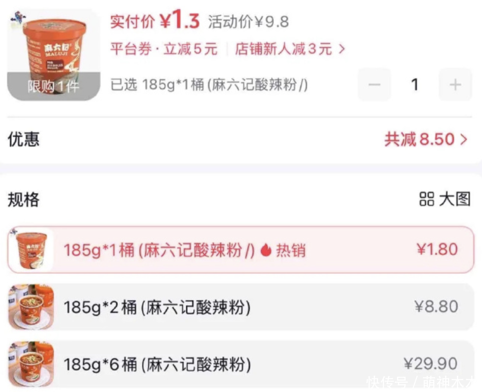 而且还有网友发现,在麻六记直播间,仍然在售卖酸辣粉,只不过部分产品的价格低到离谱,一桶酸辣粉卖1.8元,被质疑清库存大甩卖。