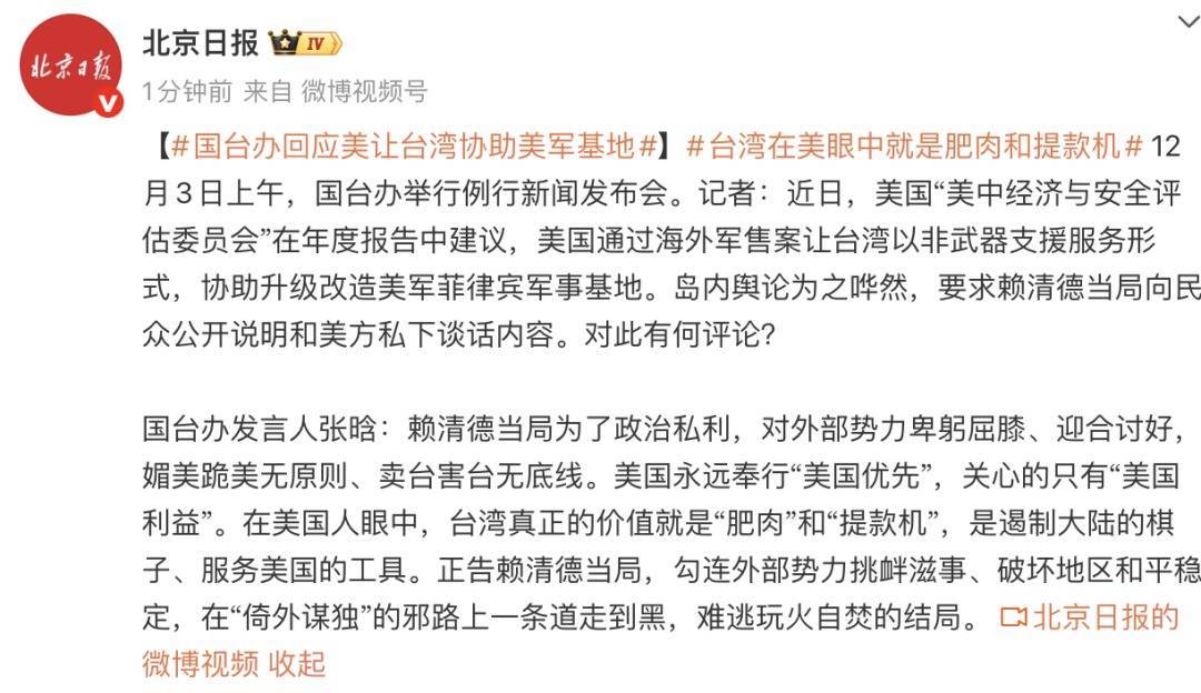 12月3日上午,国台办举行例行新闻发布会。记者:近日,美国“美中经济与安全评估委员会”在年度报告中建议,美国通过海外军售案让台湾以非武器支援服务形式,协助升级改造美军菲律宾军事基地。岛内舆论为之哗然,要求赖清德当局向民众公开说明和美方私下谈话内容。对此有何评论?
