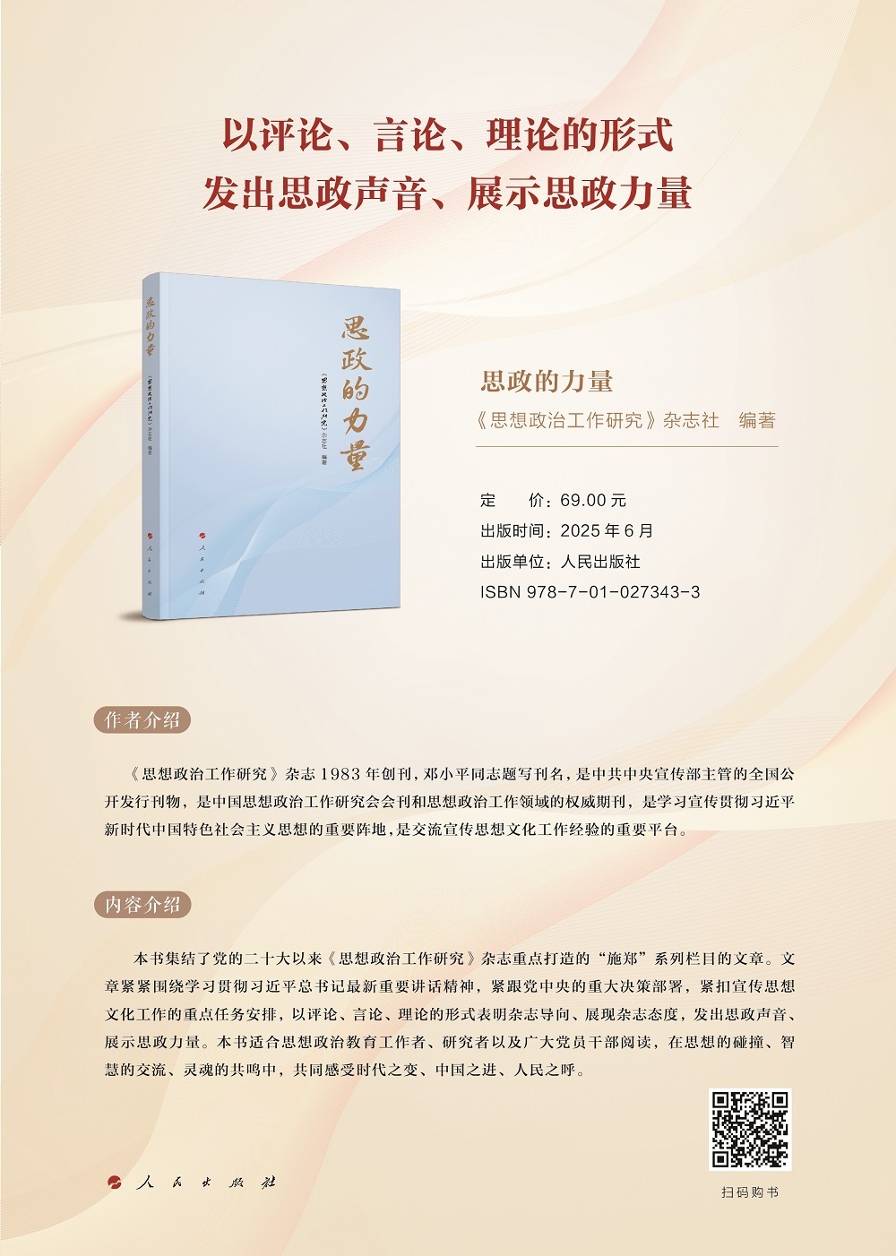 近日,由《思想政治工作研究》杂志社编著的《思政的力量》一书由人民出版社出版。本书集结了党的二十大以来杂志重点打造的“施郑”系列栏目的文章。文章紧紧围绕学习贯彻习近平总书记最新重要讲话精神,紧跟党中央的重大决策部署,紧扣宣传思想文化工作的重点任务安排,以评论、言论、理论的形式表明杂志导向、展现杂志态度,发出思政声音、展示思政力量。本书适合思想政治教育工作者、研究者以及广大党员干部阅读,在思想的碰撞、智慧的交流、灵魂的共鸣中,共同感受时代之变、中国之进、人民之呼。